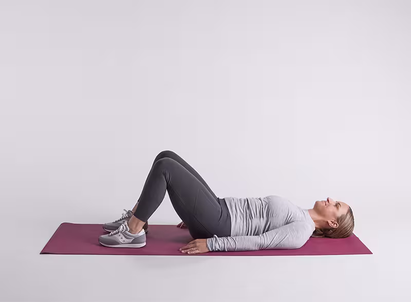 Lie on your back with your feet flat on the ground and hip-width apart. Press into your feet to lift your hips off the ground, engaging your glutes and core. Hold for a few breaths before slowly lowering back down.